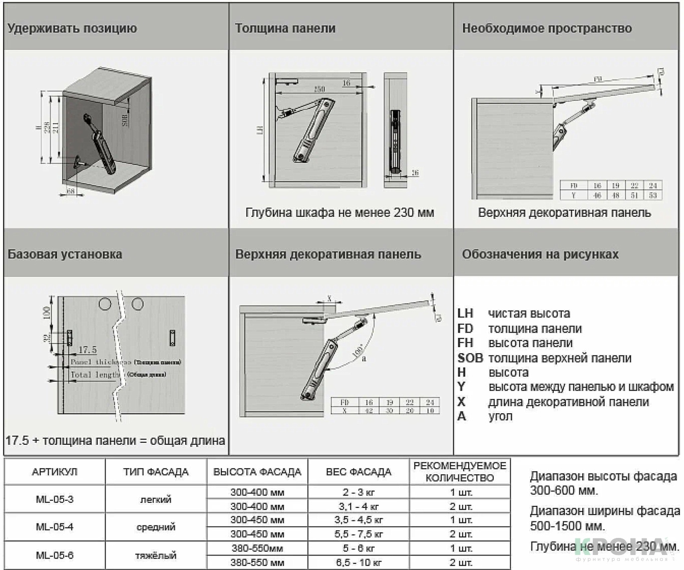 - Фасад высота 300-400 мм, ширина 500-800 мм, вес 2-3 кг - устанавливается 1 подъемник.