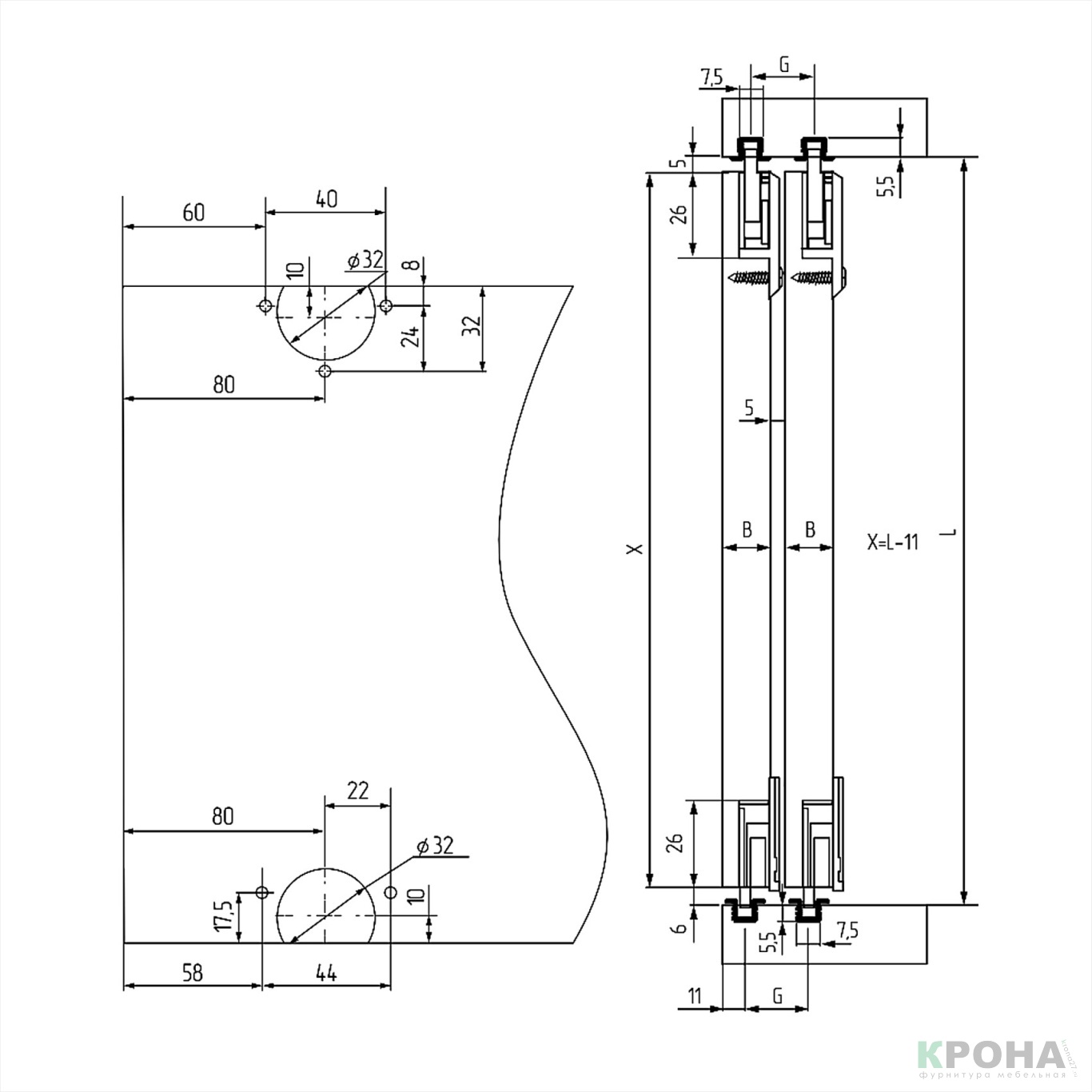 Высота двери рассчитывается по формуле X=L-11, где X — высота двери, а L — высота проема шкафа. Применение двустворчатой системы: расстояние от центра переднего паза до центра второго паза рассчитывается по формуле G=В+5, где G — расстояние между центрами пазов, а В — толщина дверного полотна.