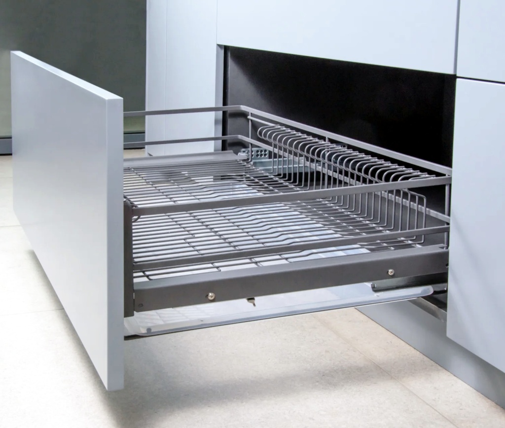 Данные выдвижные сушилки оснащены высококачественными направляющими скрытого монтажа, удобным и надежным креплением фасада и эргономичным пространством корзин.