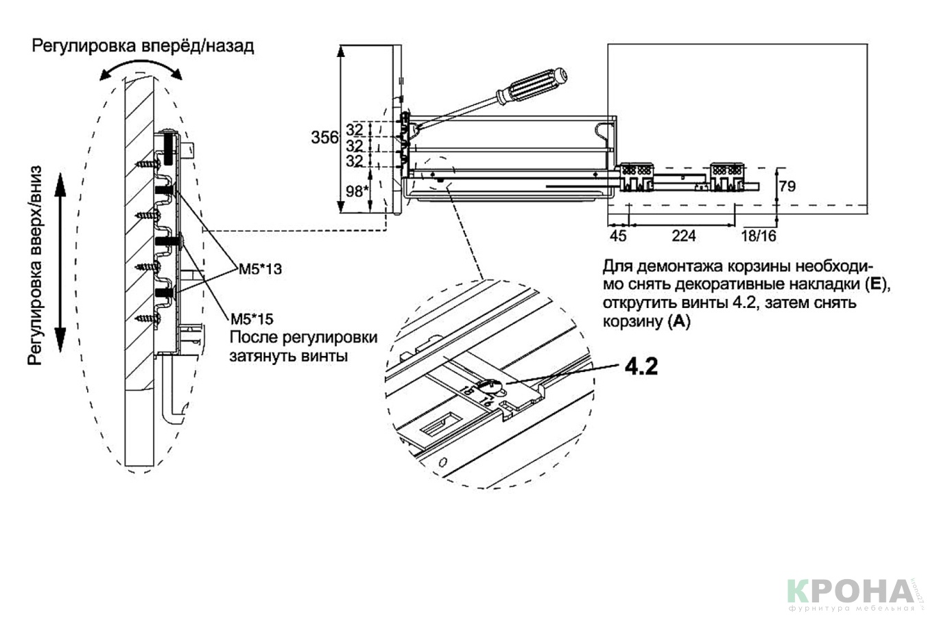 Выравнивание корзины в зависимости от ширины проема, установка защитных накладок и поддона