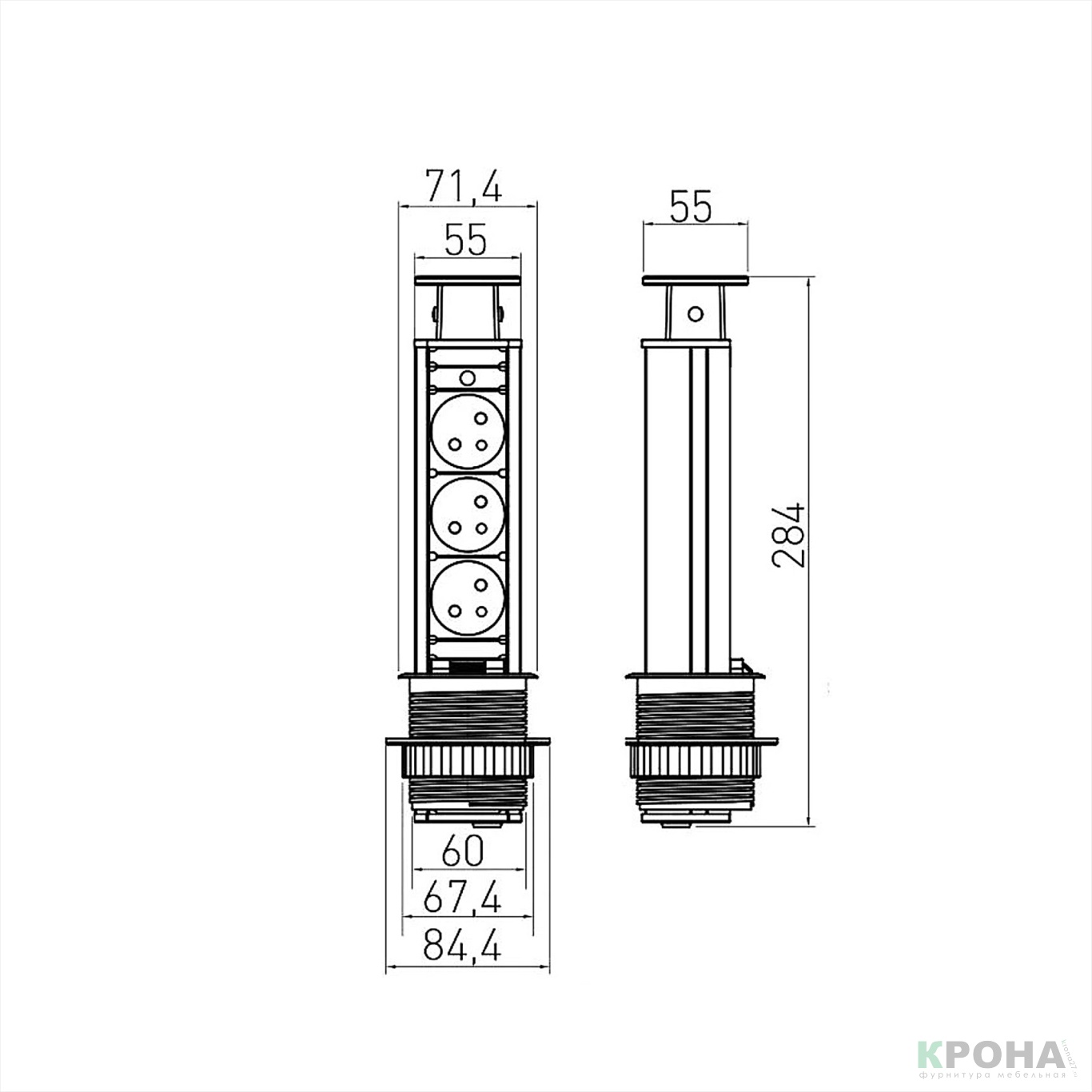 Настольный механический врезной удлинитель круглого сечения. Оснащен 3мя розетками шнуром длиной 2м с вилкой. Выдвижная система ПУШ-ОПЕН (push to open). Посадочное отверстие d=62mm.