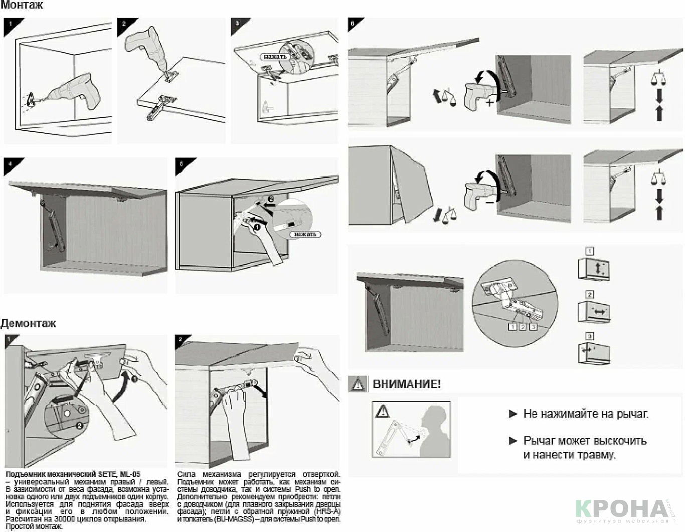 Универсальный механизм подъема двери (отделка - черненый никель) — левый или правый, в зависимости от веса фасада возможна установка двух механизмов на одну дверку. Бесшумная работа механизма. Возможность работы с петлями оснащенными доводчиком (останавливается в любом положении >30°) или петлями с обратной пружиной и толкателем push to open.