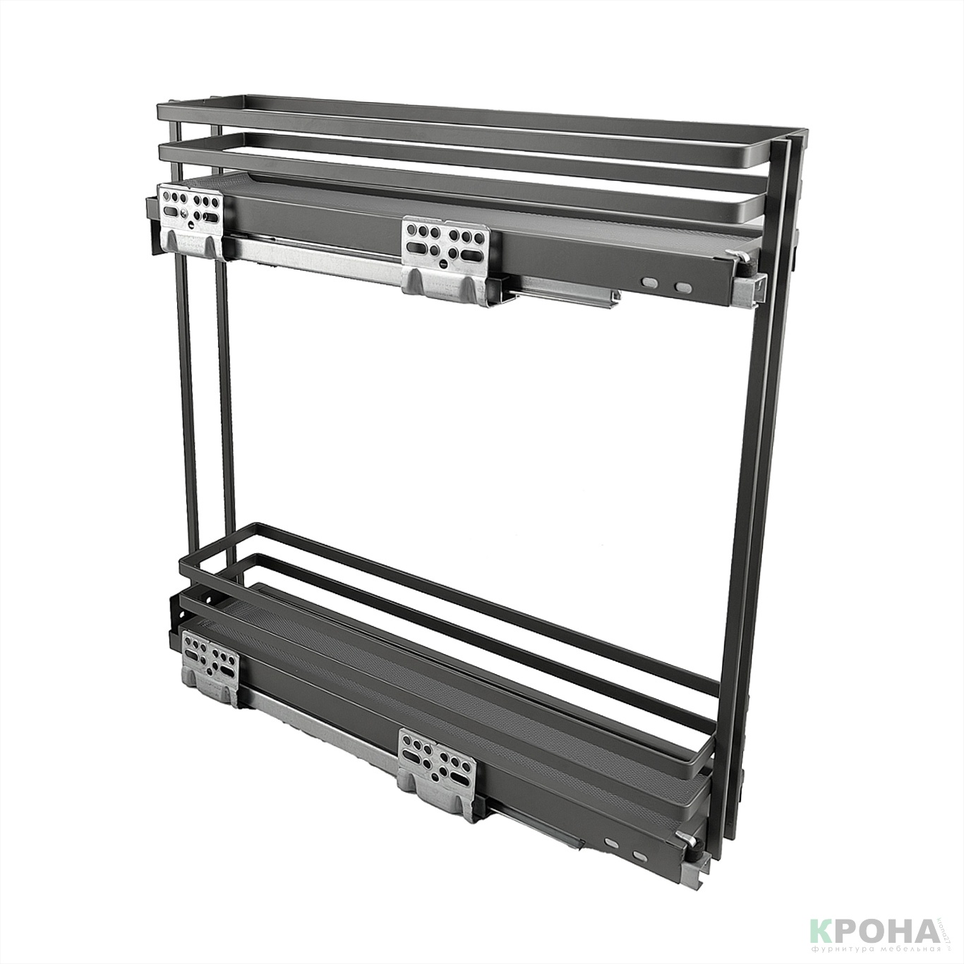 Бутылочница выдвижная усиленная премиум сегмента. Оснащена направляющими скрытого монтажа с доводчиками для плавного закрытия. Покрыта полимером матового темно-серого цвета.