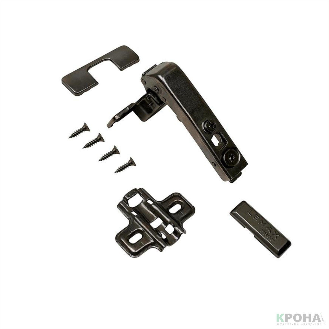 В Комплекте: петля с эксцентриком, ответная планка, заглушка на плечо петли, заглушка на чашку петли, саморезы для крепления петли к фасаду и стойке.