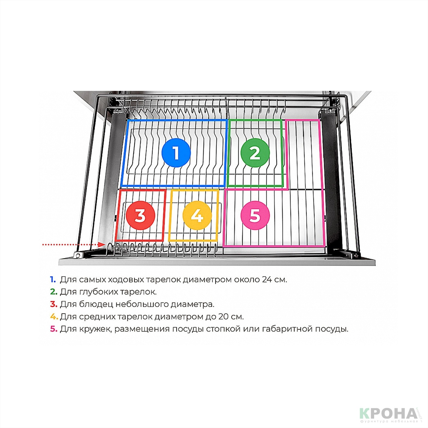 Эргономичная выдвижная сетчатая сушка в нижнюю базу с поддоном предназначена для установки в кухонный модуль шириной ~900 мм. Имеет несколько отделов для различной посуды и дополнительное свободное пространство.